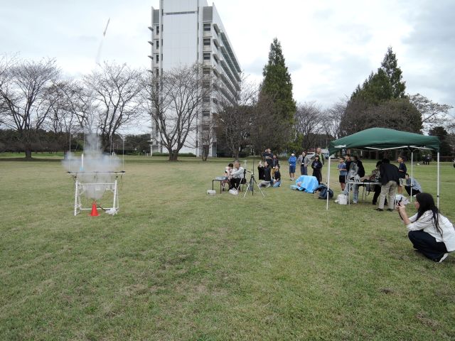 射点付近のテントでロケットエンジンにイグナイターを装着し、再度、点検をして発射台に丁寧にセットします。 ロケットの点火操作は製作した団員自らが行い、ほかの団員も元気のよいカウントダウンで応援し、次から次にロケットが大空に向けて発射されました。 打ち上げ中は風向が定まらず、風速も地上で1~2m、上空で3~4mの風が東から西に向けて吹いていたのを考慮して発射角を風上に10度程度傾けて打ち上げ、飛行コースが多少のばらつきもありましたが、すべての打ち上げ・回収が安全にできました。