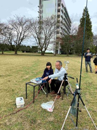 午後に雨が降る予報が出たことから昼食時間を早めに切り上げ、打ち上げ場所となる総合開発推進棟脇にあるサッカーグランドに移動しました。 今年はグランドのほぼ中央に発射台、そこから高度測定のために対角線上の4か所にアクリル製透視測定装置を配置しました。 初めに3機の試射機を打上げると1機が風で大きく流されたので、風対策として団員たちの機体のパラシュートに穴をあけて対処しました。