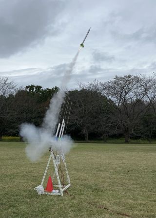 手作りロケットの打ち上げは分団員他参加者全員で応援します。