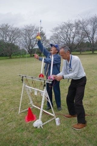 完成したロケットを検査し重量や機体長を計測します。 射点ではイグナイター装着と最終点検を行って、丁寧に発射台に設置。