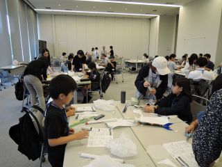 当日の10月19日(日)は曇り。風が強かったが、JAXA筑波宇宙センターの総合開発推進棟大会議室に、つくば分団の団員と保護者、分団リーダーと応援のIRWメンバーの約60名以上が集まり、手作りロケット製作を開始しました。