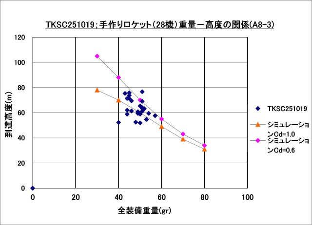 打ち上げは下の図のような結果を残すことができました。 到達高度は機体の出来具合がとても良く、IRW手作りロケットの飛翔高度予想の範囲でまとまっていました。 次回はさらに高く飛ぶように、ロケット作りに挑戦して欲しいです。