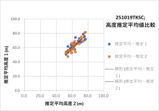 更にA-BとC-Dの2セットの高度測定を行った結果から、A-B高度の平均値は約64m、C-D高度の平均値は約63mでほぼ同じでした。相関係数は0.54で半数近くが5m以下の差となりました。