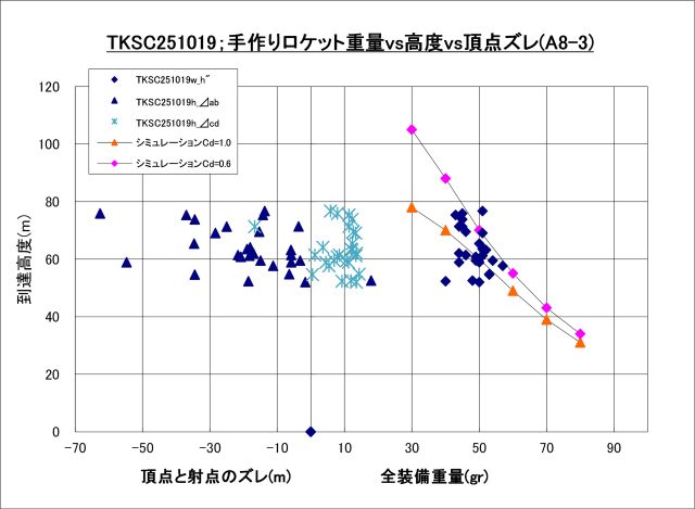 このような手作りロケットの出来映え(ロケットの重量、全長、重心位置等)と実際に飛んだ高さ等の記録を整理してみました(下図、および活動レポートに掲載の飛翔データ参照)。 その結果、気持ちよく高く・パラシュートが見事に開いた手作りロケットは、ロケットの重量が40gr程度と軽く、機体の長さ;全長50cm程度)で重心位置が適正な位置関係にあり、綺麗(ノーズコーンの形状や尾翼の平坦具合を含め)で丈夫に仕上がると素晴らしい結果(到達高度80m以上)が出ることが判ります。 反面、重心位置設定やノーズコーン、尾翼の取り付けなど機体の変形(傾き、曲がり、機体強度不足)があると空気抵抗(cd)の影響他で、不安定な飛翔もします。 皆さんもいろいろ挑戦してみてください。